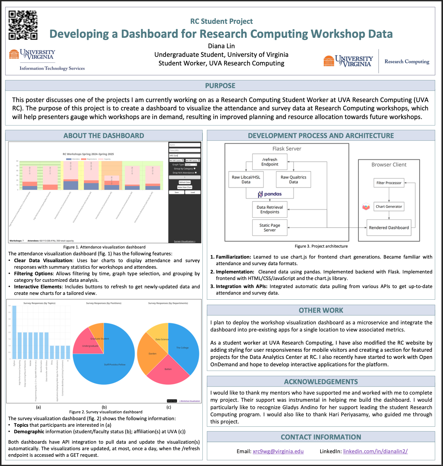 Project Description: Diana developed an interactive dashboard to visualize attendance and survey data from UVA Research Computing workshops. Using Chart.js and Flask, she implemented dynamic visualizations with filtering options and integrated live data pulling from various APIs. Her work supports improved planning and analytics for Research Computing workshops. She also contributed to the RC website and began exploring Open OnDemand for future interactive apps.