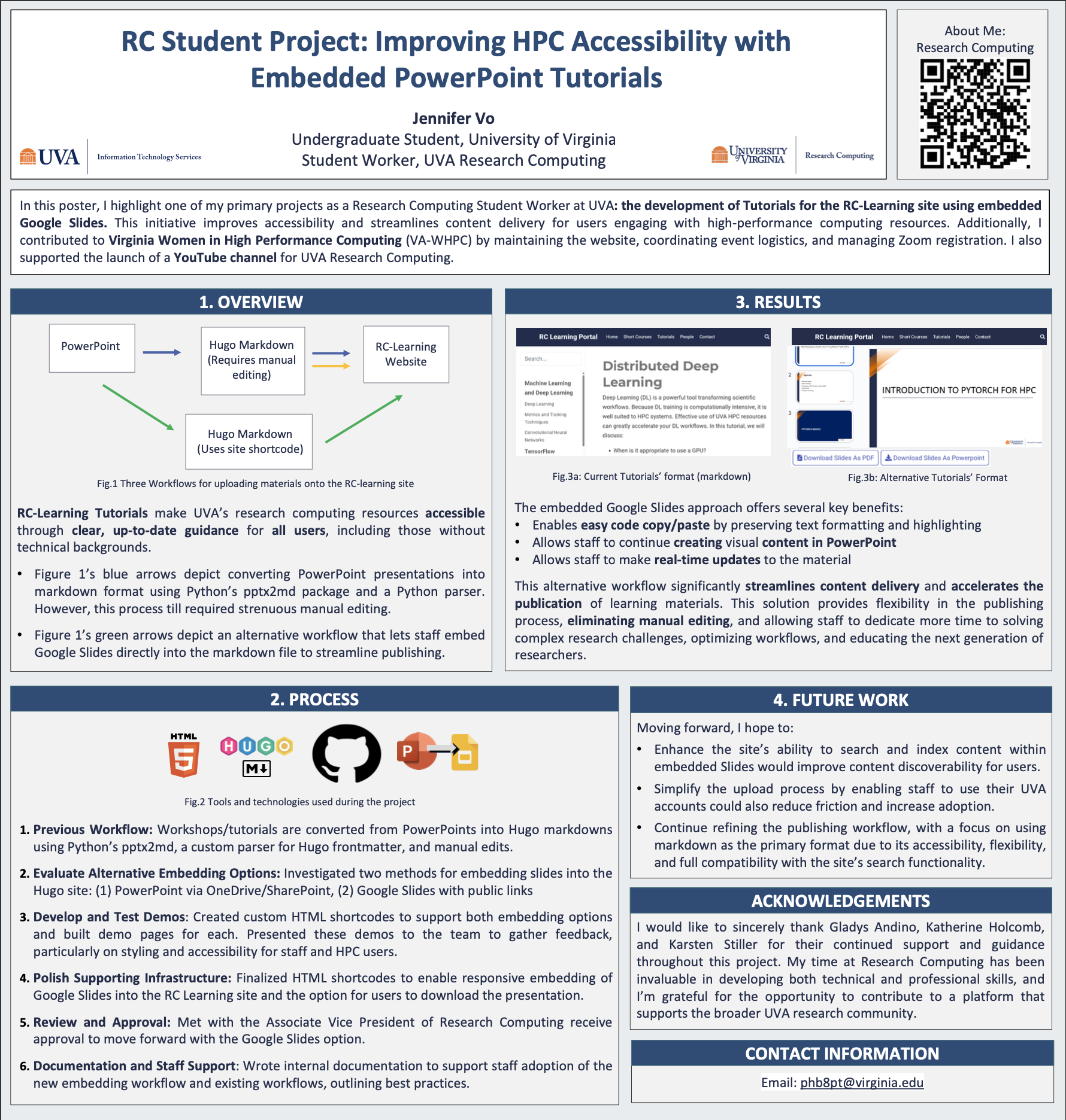 Project Description: Jennifer contributed to the development of Tutorials for the RC-Learning website using embedded slides, streamlining content delivery. Jennifer also contributed to Virginia Women in High Performance (VA-WHPC) by maintaining their website, coordinating event logistics, and managing Zoom registration. She also supported the launch of a YouTube channel for UVA Research Computing.
