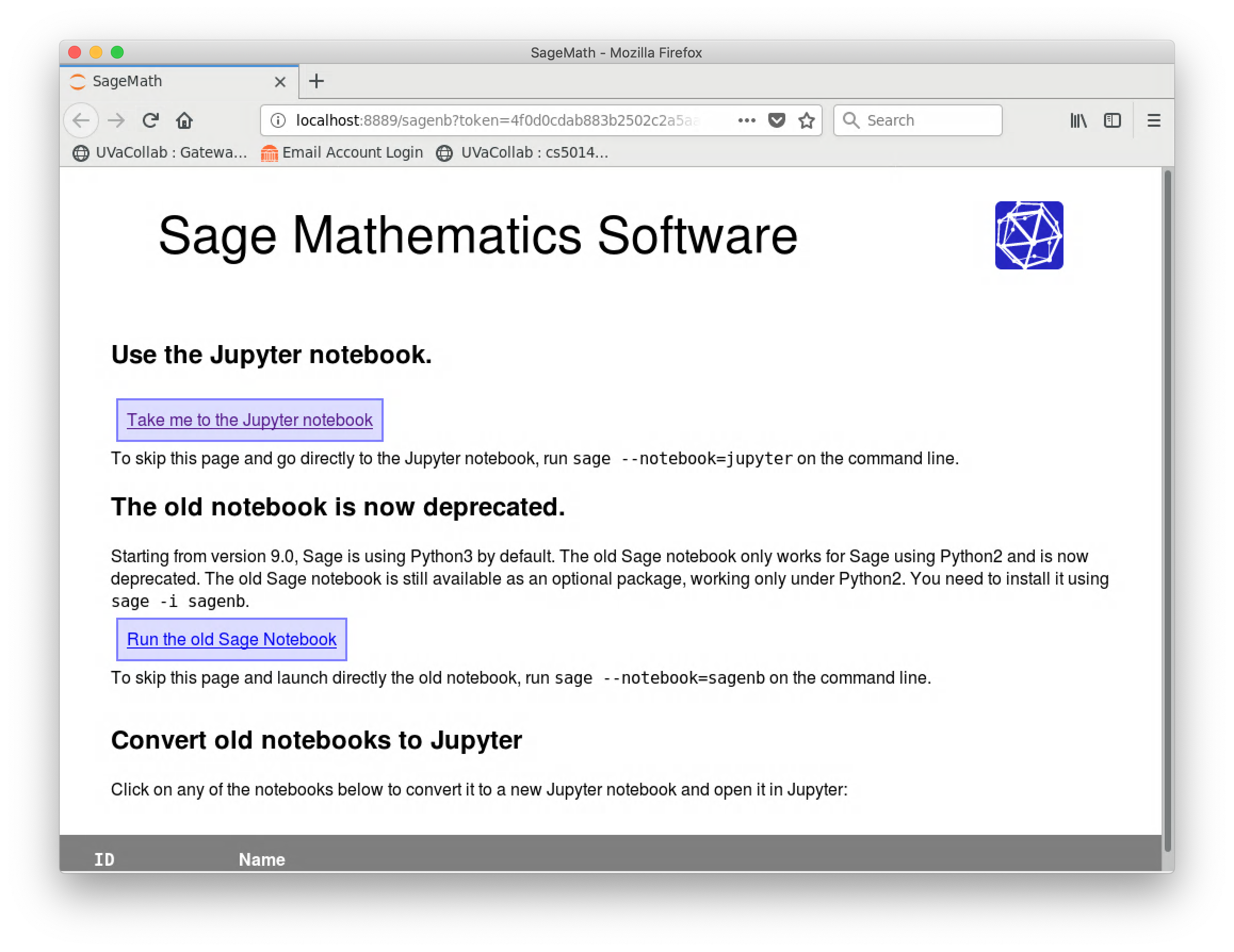 Then after executing the command to start the sagemath Jupyter notebook, you should see